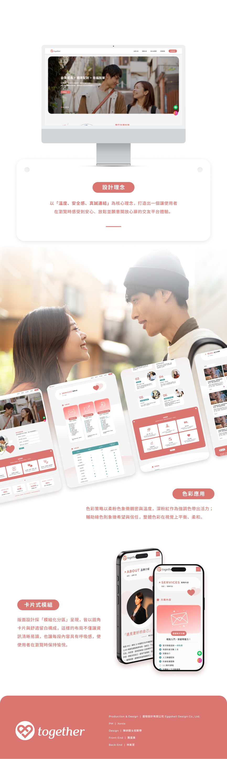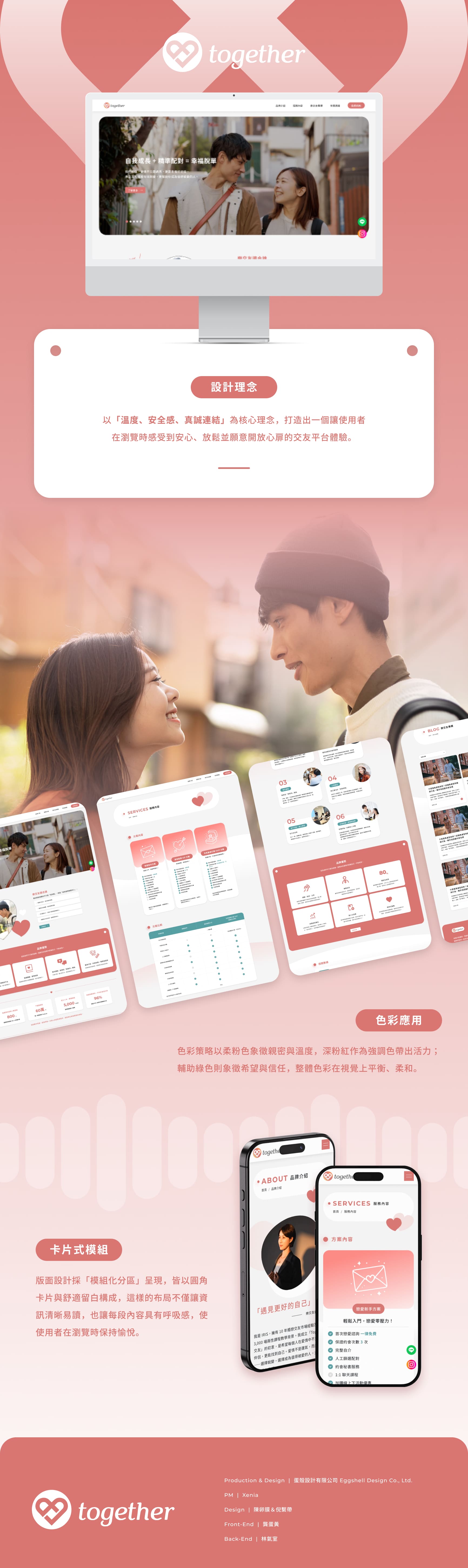 本交友網站的設計理念以「真實、安心與陪伴感」為核心,回應現代人在情感關係中對信任與溫度的需求。整體視覺風格已標準色的珊瑚紅與米白作為主色,象徵愛情中的熱情與安全感,避免過於冷調或科技感的配色,降低交友平台常見的距離與壓力,讓使用者在進站的第一刻就感受到被理解與接納。